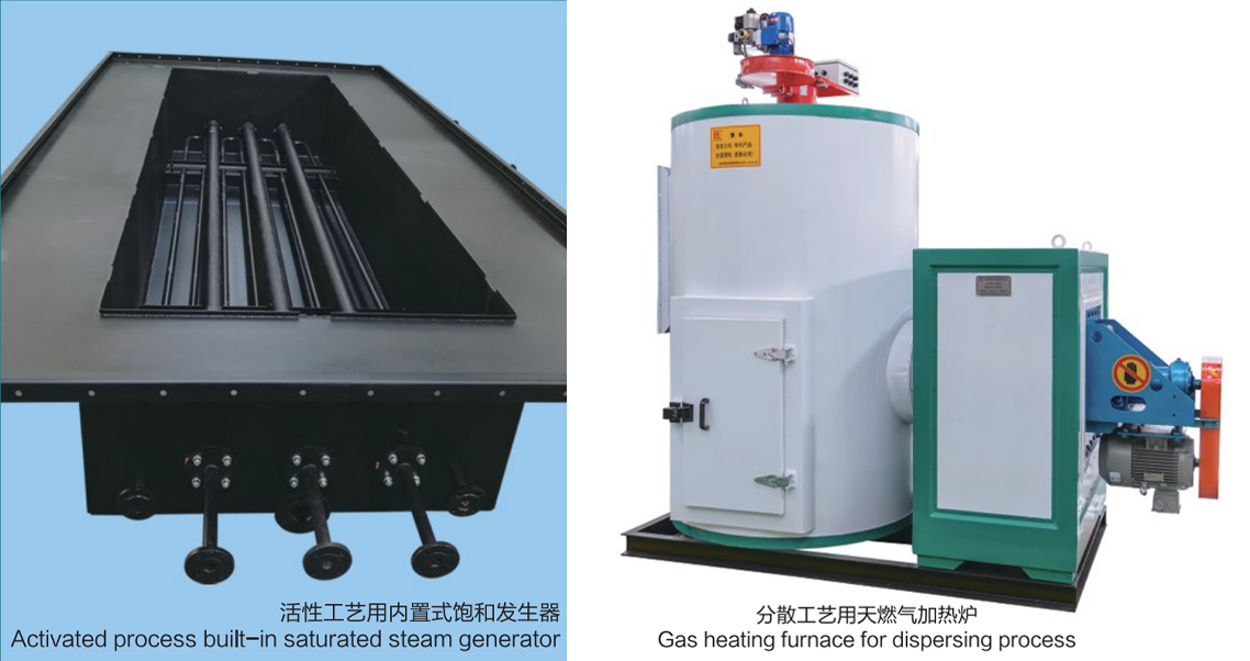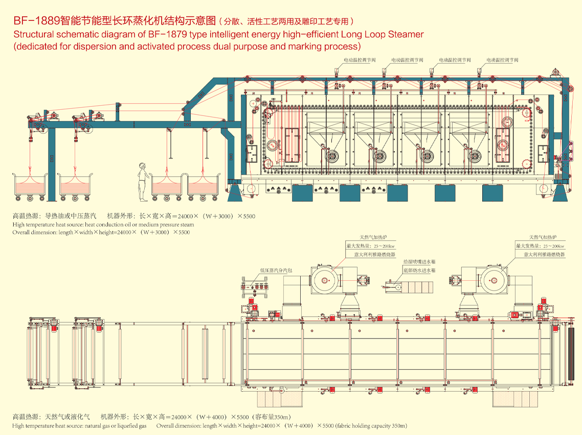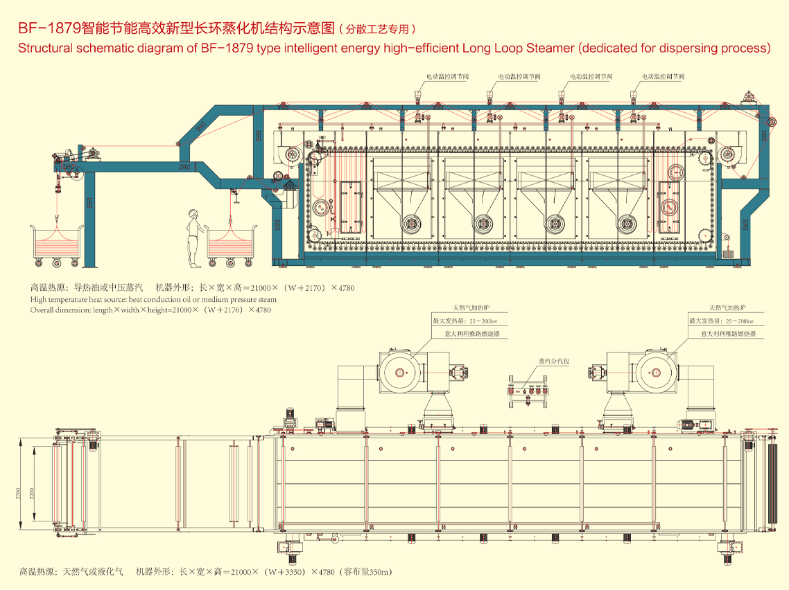1、分散工藝:本機配備2台天然氣加熱爐,前麵(miàn)一(yī)台給進布(bù)成環箱體及2個中段箱(xiāng)體加熱、後麵一台給2個中段箱體及出布箱體加熱;保(bǎo)證蒸箱內前後(hòu)溫(wēn)度(dù)穩定一致;溫差極小,工藝溫度士(shì)1℃,獨有的成環噴汽加濕(shī)使發色更為鮮豔;(中壓蒸汽及導熱油為軋片式散熱器)
